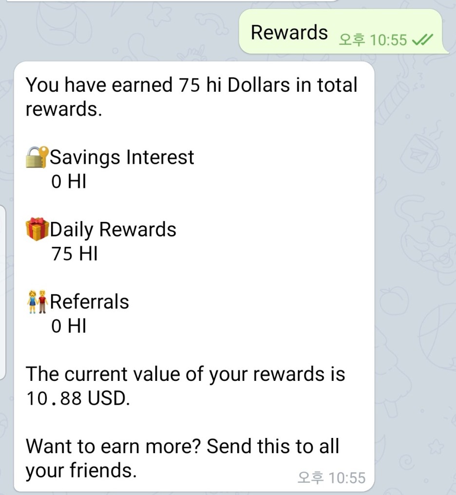여기에서 Reward를 클릭 하시면 그동안 모은 Hi 달러와 가치가 나옵니다.