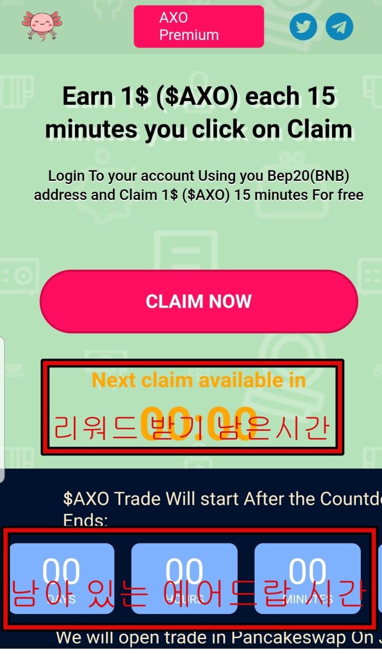 Axo 에어드랍은 위 링크주소에서 받으실 수 있으며 BSC 지갑이 필요합니다.