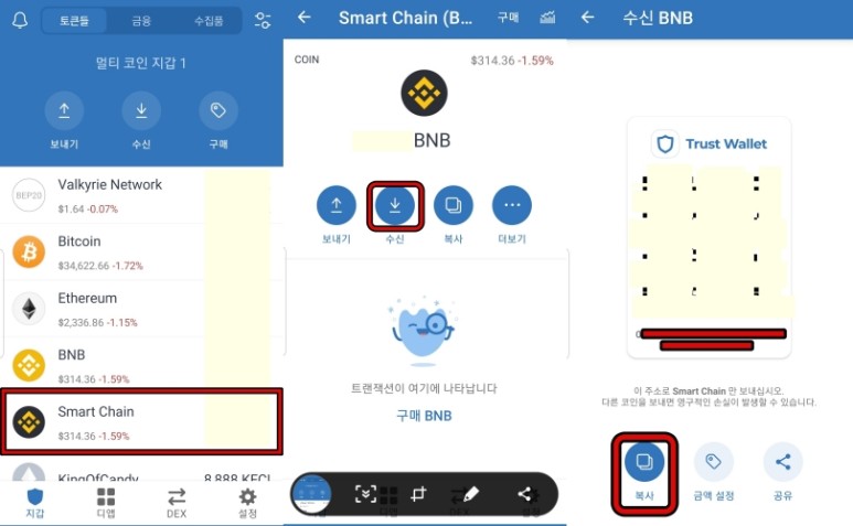 Smart Chain을 클릭 하신 후 수신을 클릭 하셔서 나온 지갑 주소가