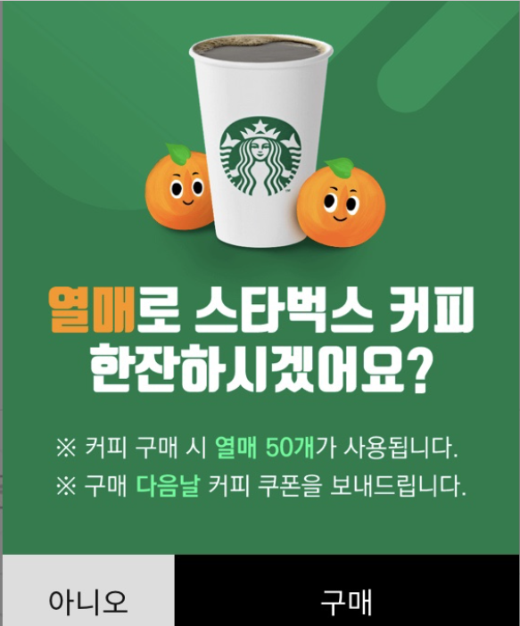 인증을 완료하시면 열매 100개를 받으시고 스타벅스 아이스 아메리카노를 50 열매로